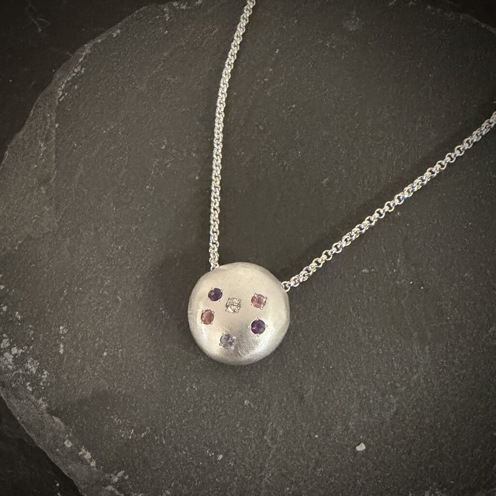 Collier constellation en argent avec un diamant, deux améthystes, deux tourmalines et une tanzanite